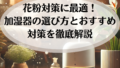 また、加湿器も浮遊している花粉が床に落ちやすくなるため効果的です。